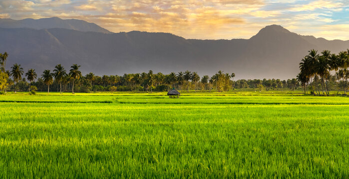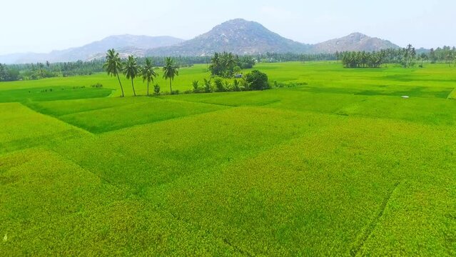 Revealing huge land of paddy field with coconut trees surrounded by mountains