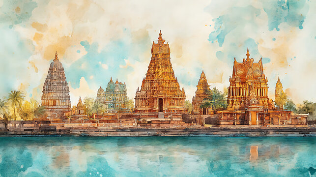 Watercolor panorama of iconic temples for tamil nadu day celebration