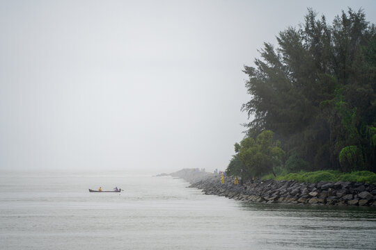 Zoomed shot showing fishermen in a rowboat out in the storm wearing rain coats showing the livelihoods that are dependent on the sea and the brackish backwaters in south India Kerala, Tamil Nadu, Karn