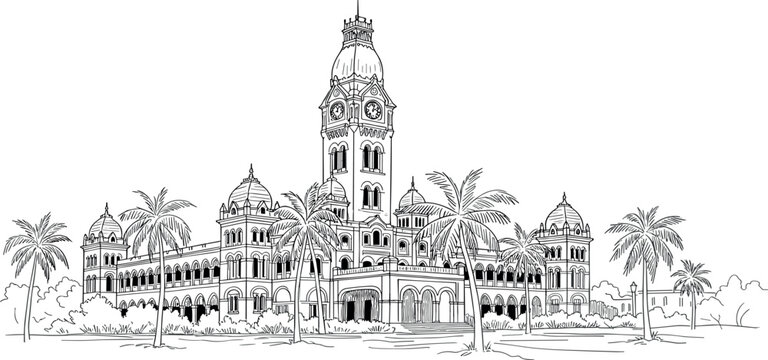 Ripon Building in Chennai India line art illustration Historical colonial architecture landmark sketch.
