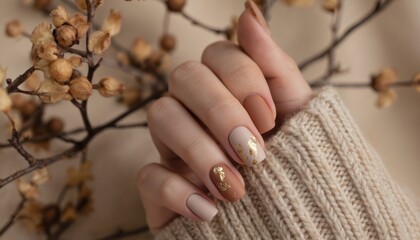 Elegant matte autumn manicure featuring natural brown shades with subtle gold leaf accents. Nails adorned with warm, cosy design. Hand in cream knit sweater with dried plant branches complements