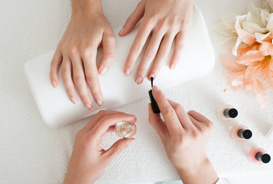 Manicure Acrylic Nail Shape. Nail Coating and Strengthening for Modern Design. Beauty Salon Close-up