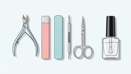 Nail care tools and nail polish bottle with various manicure instruments arranged neatly