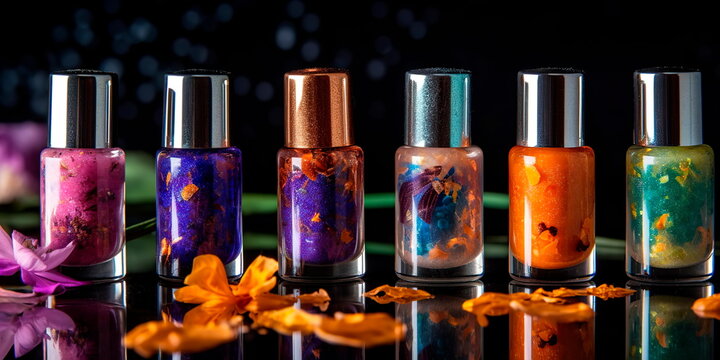 chemical-based nail polishes and natural, non-toxic alternatives made from plant-based ingredients, highlighting their long-lasting and vibrant colors. Generative AI