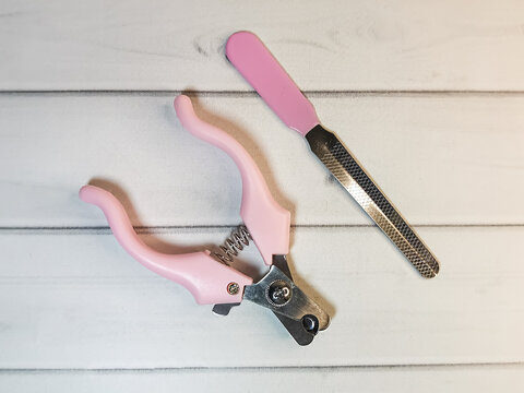 Grooming scissors with pink handles and emery board for pet on a light wooden background. Grooming tools for the hygienic care of pets cats and dogs.