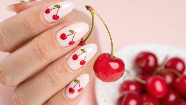 Pastel gradient nail art, Minimalist trendy style Nail art featuring cherry designs and fresh cherries, showcasing a creative beauty trend.