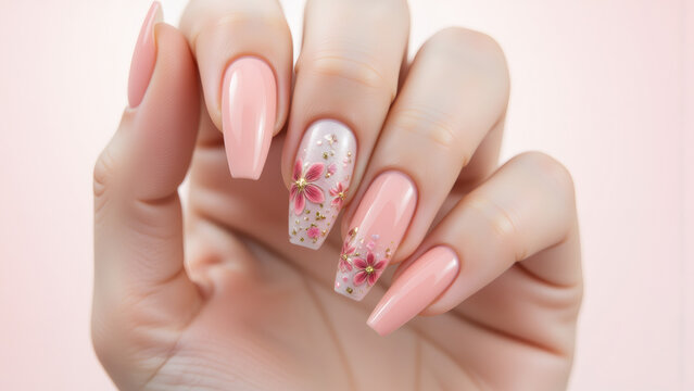 Elegant Pink Manicure with Floral Design, Nail Art Beauty, and Fashionable Style