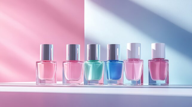 Isolated image of a set of nail polish bottles on a white surface, perfect for beauty product marketing.
