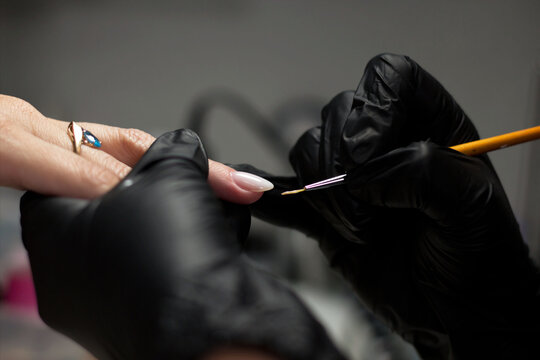 Close-up of a nail technician wearing black gloves, meticulously applying nail art with a fine brush to a client's fingernail. The scene highlights the precision and detail involved in nail design.