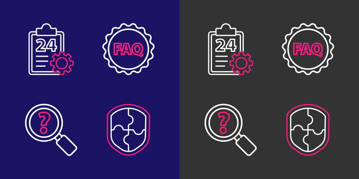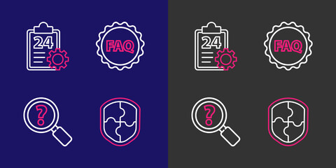 Set line Shield, Unknown search, Label with text FAQ and Checklist 24 hours service icon. Vector