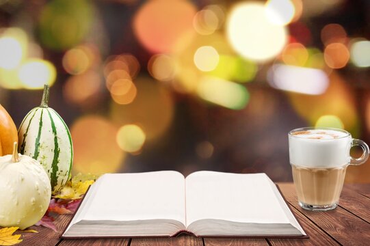 Autumn books.Autumn cozy reading.Stack of books, red hokkaido pumpkins with glowing garland, checkered scarf close-up on a wooden table.NaNoWriMo Writing Autumn Marathon