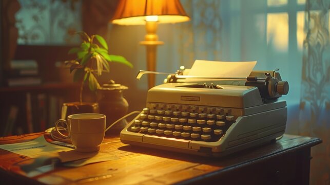 Generative AI illustrations, Writing Concept, Autumn Books, retro black typewriter and books with yellow