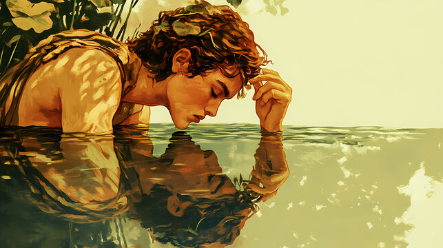 Narcissus in love with his own reflection in the water , narcissism concept. Mythology. Illustration