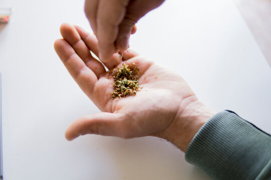 Close-up of hands mixing marijuana joints and tobacco product over table