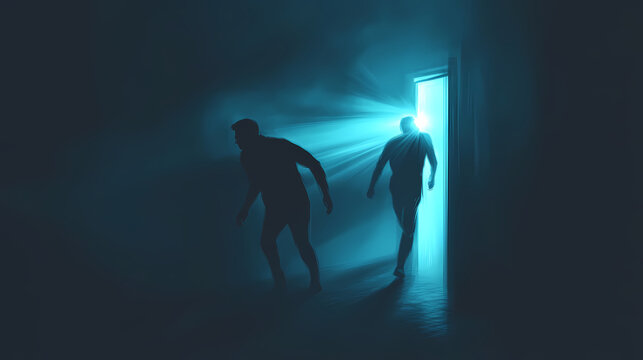A close call as a thief narrowly avoids being caught by a guard, glowing flashlight beams sweeping the area, cinematic tension. Light and Shadow Beings. Illustration