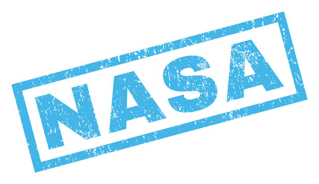 NASA text rubber seal stamp watermark. Tag inside rectangular shape with grunge design and scratched texture. Inclined vector blue ink sign on a white background.