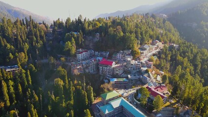 Aerial view of buildings nestled among lush green trees, the scene is bathed in sunlight, creating a warm and inviting atmosphere, Nathia Gali, Khyber Pakhtunkhwa, Pakistan.