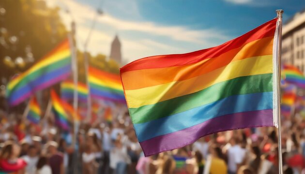 lgbt flag on the background of the pride parade, queer lgbtq pride month, June 1, the fight against homophobia and bullying, tolerance, summer holiday, freedom and rights