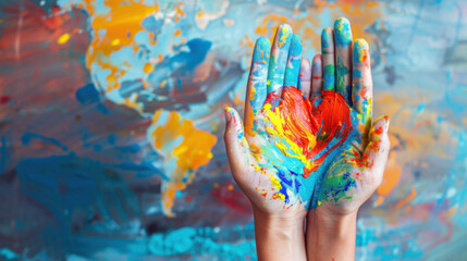 World Kindness Day. Palms with painted multi-colored heart. Horizontal banner. Copy space. Volunteer activities, donate and family insurance concept. Humanitarian Day. World heart day. Valentine's Day