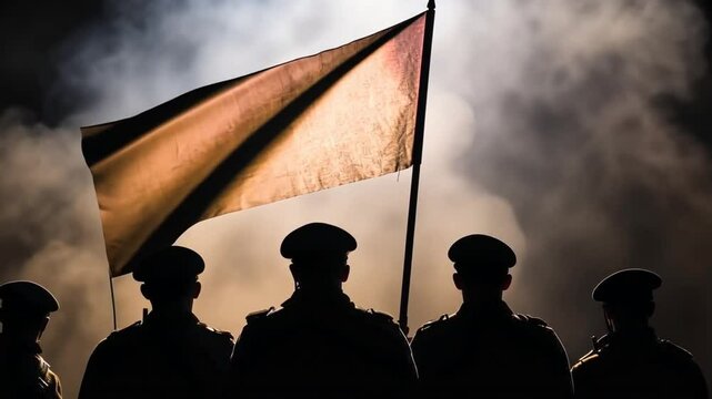 A powerful composition of soldiers seen from the rear, holding the national flag with dignity, against a shadowy background illuminated by subtle, dramatic lighting