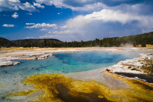 Steam rises over the colorful Sapphire Pool, a hot spring in Biscuit Basin, Yellowstone National Park, Wyoming.