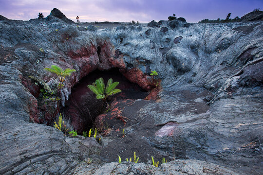 A giant tree fern (Cibotium menziesii, hapu`u) buds inside a collapse lava tube, Hawai`i Volcanoes National Park, Hawai`i