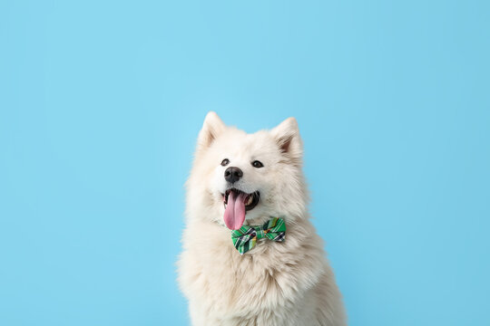 Cute dog with bowtie on color background. St. Patrick's Day celebration
