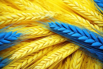 Ears of wheat on Ukrainian national flag. Symbols of Ukraine. AI generated