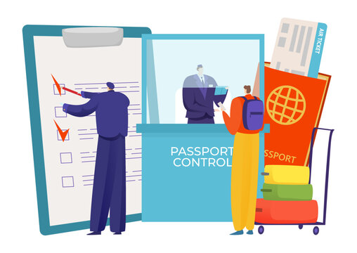 Inspector officer checking passport control, tiny character passing customs inspection flat vector illustration, isolated on white.