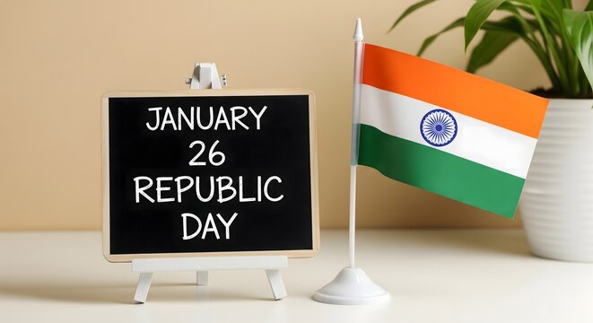 Indian Republic Day concept with desk calendar showing January 26 and a small national flag, symbolizing patriotism, democracy, national pride, and official holiday celebration in a clean workspace.