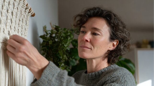 A Caucasian woman intricately weaves macrame art, embracing Hygge coziness and the serene charm of National Craft Month