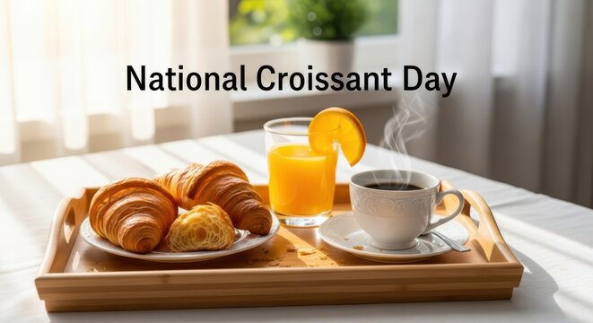 National croissant day celebration with fresh croissants, orange juice, and coffee on a wooden tray