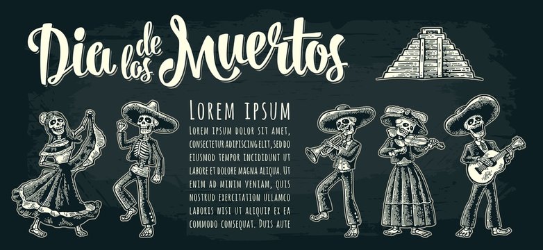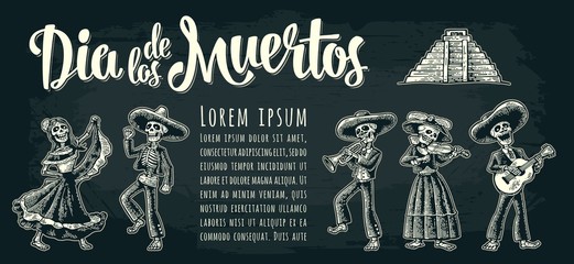 Horizontal poster for Day of the Dead. Dia de los Muertos lettering.