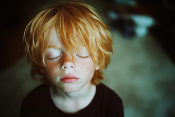 Freckled red-haired boy with closed eyes in serene expression, indoors, soft lighting, peaceful childhood moment, tranquility concept, National Day of Unplugging