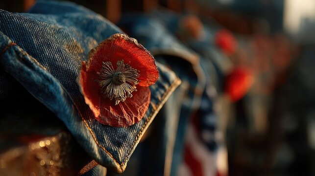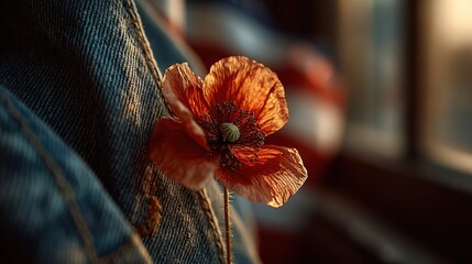 A red poppy on denim honors Memorial Day, with a flag softly behind, bathed in golden light. Remembrance and patriotism in a simple symbol.