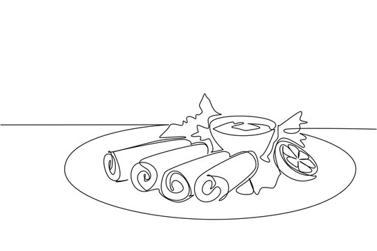 Continuous line drawing of delicious egg rolls served with sauce on a plate, highlighting food concept and international event theme for National Egg Roll Day celebration.
