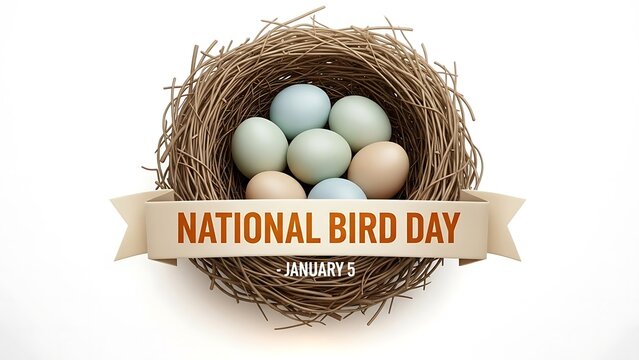 A nest filled with eggs on a wooden surface with a national egg day banner on the right side