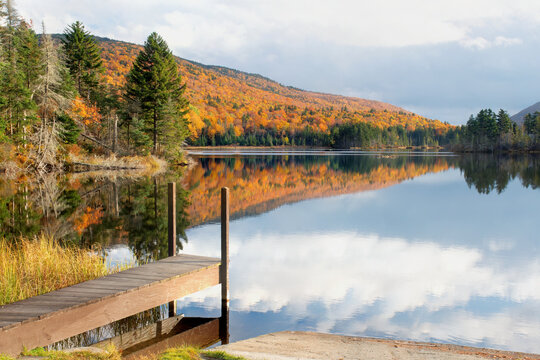 Tranquil autumn scene in White Mountain National Forest of New Hampshire. Wooden boat dock with reflection of sky and colorful fall foliage on calm surface of scenic Long Pond.