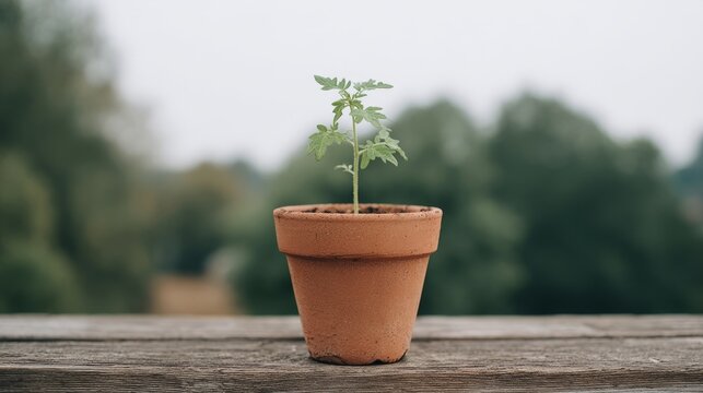 Terracotta pot cradles hopeful tomato sprout, echoing Earth Day's green whispers and National Gardening Week's nurturing touchstone