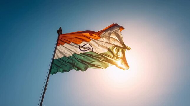 Indian national flag waving gracefully on a tall pole against a clear blue sky, vivid tricolor fabric with visible Ashoka Chakra, high contrast lighting and patriotic atmosphere, full flag view