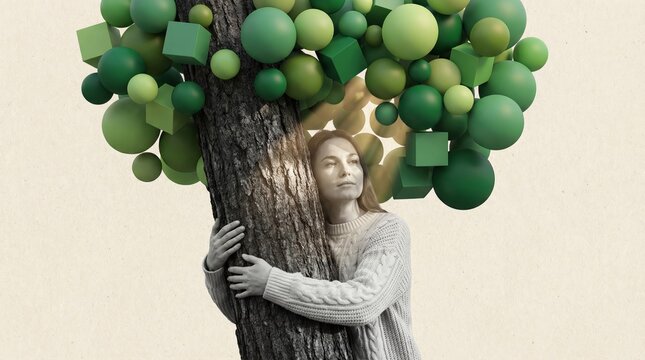 Woman hugging tree with green spheres and cubes for National Hug Day concept