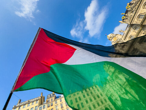 Palestinian Flag Waving in Vibrant City Square Under Blue Sky
