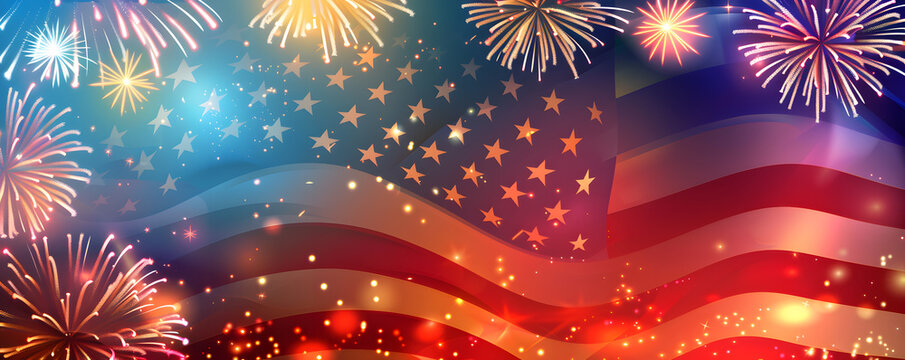 American flag with fireworks and bokeh lights celebrating Independence Day.
