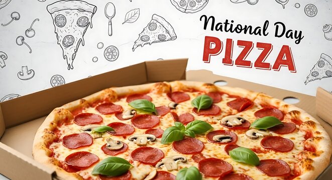 Celebrate the joy of America's favorite comfort food with a graphic announcing national pizza day on february ninth featuring a delicious close up of a freshly baked pepperoni pizza.