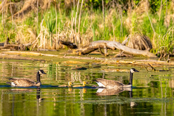 Two adult Canada geese (Branta canadensis) swimming in a swamp pond with two goslings between them on a sunny day; Elk Island National Park, Alberta, Canada