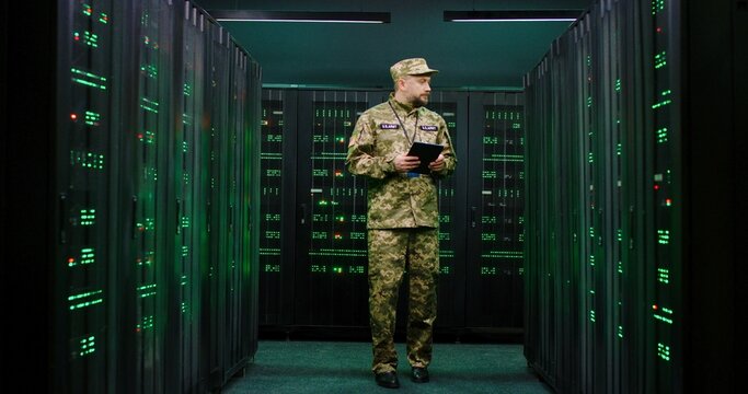 Caucasian military male officer coming in the server room with tablet device in hands, working with secret data and anti-terrorism information. Cybersecurity concept.
