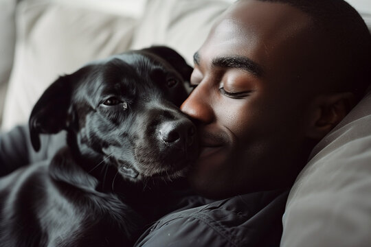National Pet Day, Happy Man and his Adorable Fluffy Dog Close Up Portrait