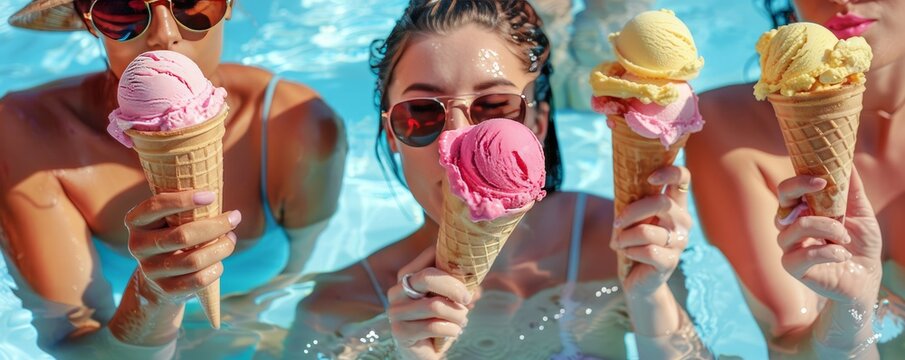 Friends having a pool party for National Ice Cream Month, September 2nd, cooling off with ice cream treats, 4K hyperrealistic photo.