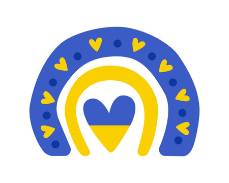 Hand drawn boho rainbow in ukrainian blue yellow colors with hearts isolated on white background. Vector flat illustration. Design for print, sticker