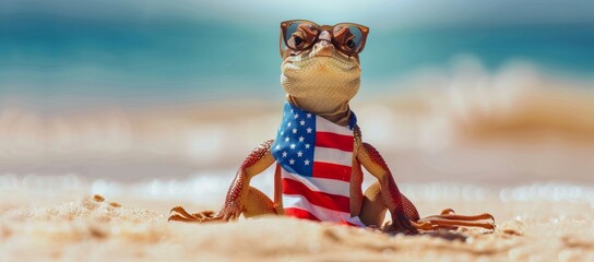 Cute and happy dog ​​looking out of the window of a car running on a beach road wearing an American flag hat and sunglasses summer vacation animal lover design Independence da 4th of july patriotic ho